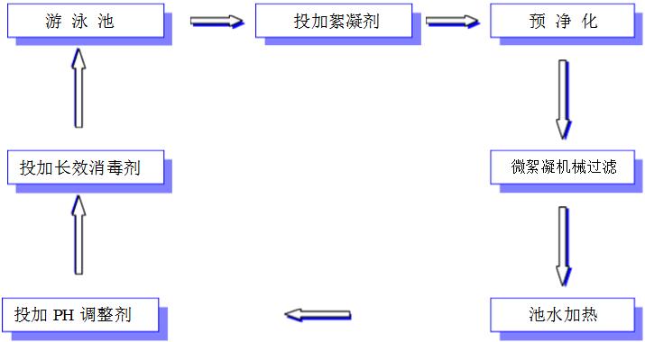 游泳池內(nèi)的水通過池底回水管道,經(jīng)毛發(fā)聚集器。去除毛發(fā)、紙屑、雜草及大塊顆粒狀雜物,再有加藥裝置加入混凝劑,經(jīng)循環(huán)水泵的葉輪攪拌混合后進(jìn)入過濾器,利用過濾器內(nèi)的濾料濾去懸浮物,過濾后的水再經(jīng)消毒處理(冬季循環(huán)水需經(jīng)換熱器加熱),使之達(dá)到國(guó)家規(guī)定的游泳池水質(zhì)標(biāo)準(zhǔn)后,送回游泳池再使用。游泳池水就這樣連續(xù)不斷地進(jìn)行著凈化處理,再使用再凈化的循環(huán)過程。
