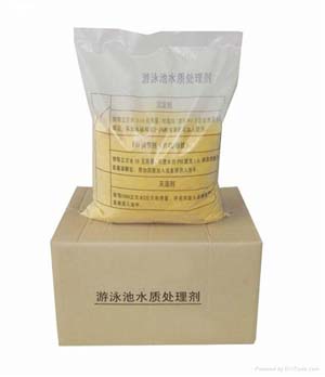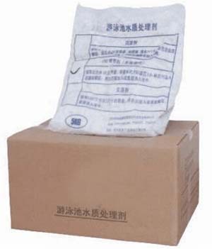 泳池放滿水后,(視水質(zhì)情況)投放TCCA片劑,速溶片劑按每m32-4g量直接均勻地撇如池水中,藥片沉入池底月15分鐘即完全溶解。放藥時間選擇收場后或早上無人游泳時。正常時間最好在開放前1-2小時加藥。緩溶片劑在循環(huán)系統(tǒng)加藥裝置投加。絮凝劑可依據(jù)水質(zhì)渾濁度的標(biāo)準(zhǔn)來施放。不符合此標(biāo)準(zhǔn)應(yīng)投放,絮凝劑一般每星期1-2次。用量沒1000m3水放5-10kg,投放前應(yīng)測試水中PH值,如PH值偏低(<7)應(yīng)加PH。