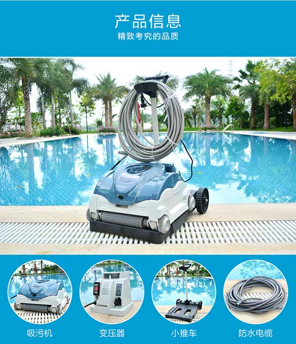 彩鯊增強型全自動吸污機可爬墻清洗泳池四周的池壁,吸污機采用紙芯過濾器、過濾精度為5微米,過濾效果好,能有效吸走池底的各類臟東西,還可以過濾水中懸浮的細小灰塵。